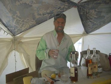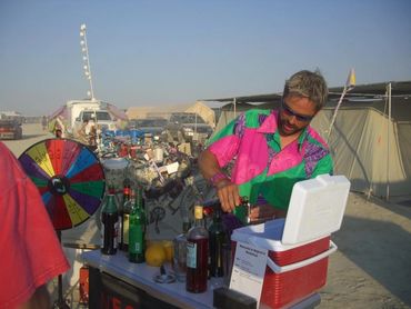 I started going to Burning Man in 1998 and have not missed an official event since 2001. My wife and I, along with friends, started our theme camp, Frogma, in 2003. For years now, I have been serving drinks from my mobile bar, Negroni's Workshop. Those who happen upon it in the deep playa can choose from three spirits, three bitters, and three sweet vermouths, or, if they are feeling adventurous, they can spin a wheel that will make the choice for them. My favorite version consists of Mezcal, Gran Classico, and Carpano Antica. Since 2022, I have also run a speakeasy bar called the Wise Owl in the Golden Guy district. Look for me in the Golden Guy East in the 4:30 sector, serving Negronis and/or other specialty cocktails. Contact me with questions or comments.